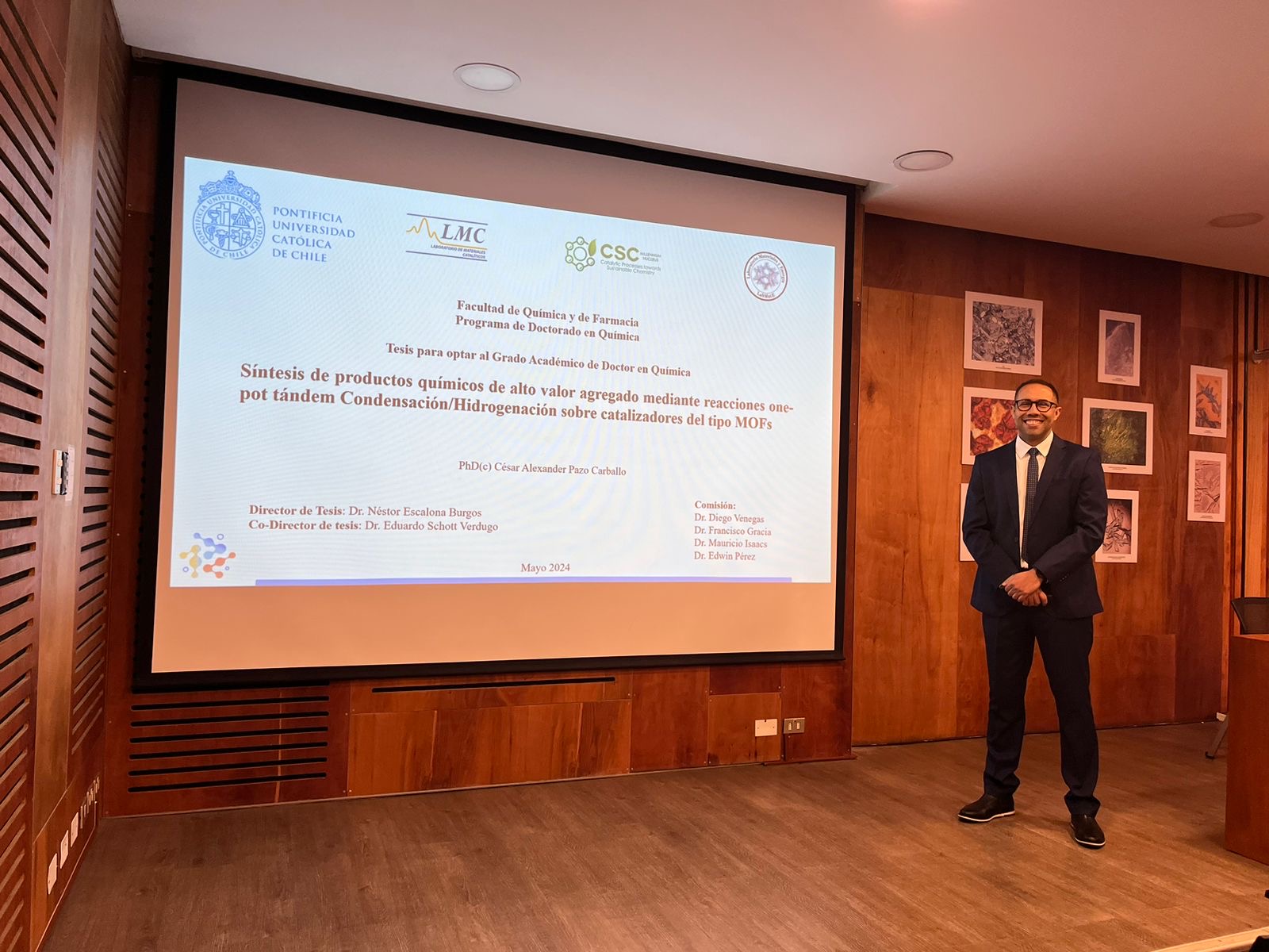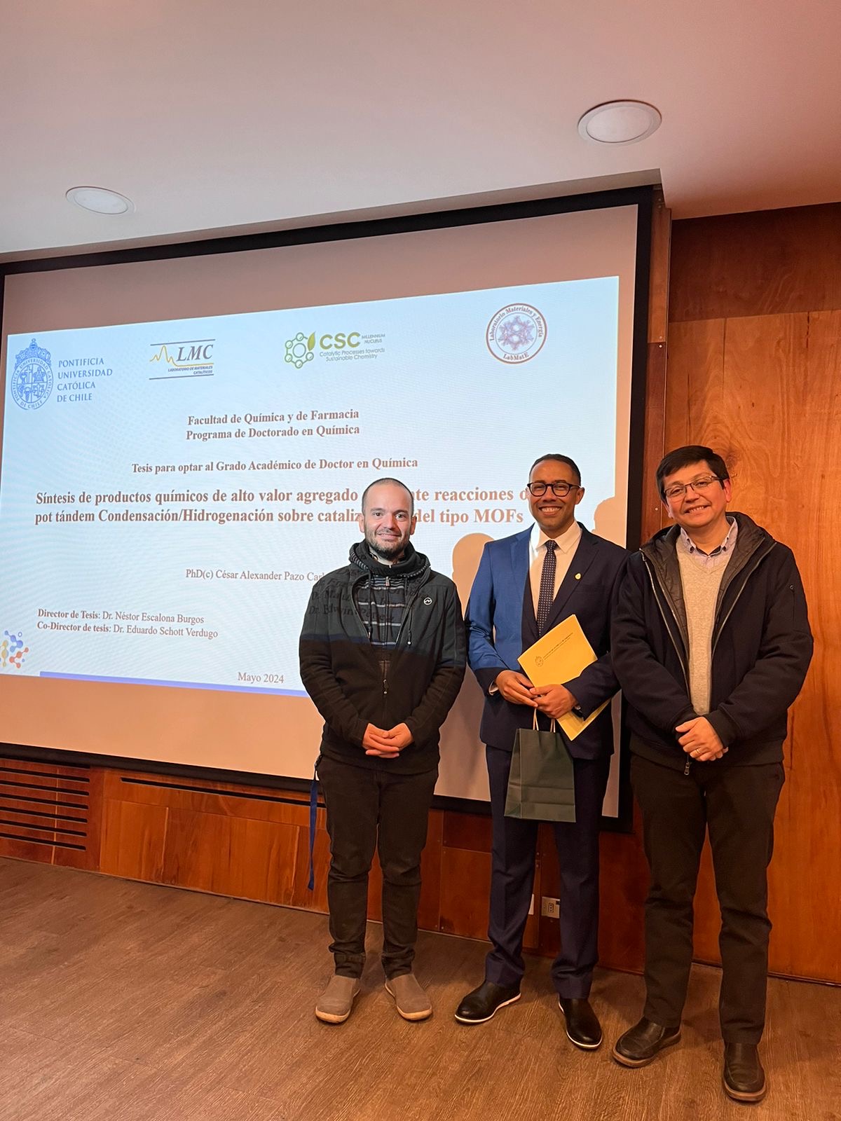 Su tesis se tituló “Síntesis de productos químicos de alto valor agregado mediante reacciones one-pot tándem Condensación/Hidrogenación sobre catalizadores del tipo MOFs” y tuvo como profesor tutor al director del Núcleo Milenio CSC, Dr. Néstor Escalona.